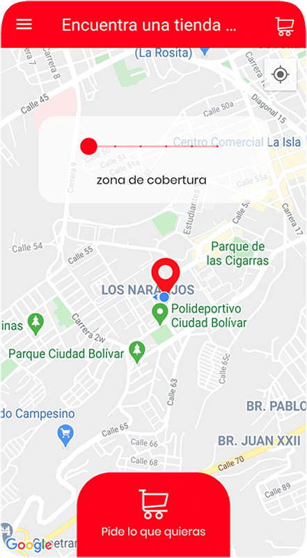 El rango de cobertura para buscar la tienda, tienes entre 500 y 1000 mil metros para más opciones de tiendas.